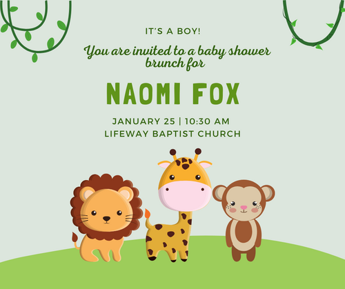 All ladies are invited to help Naomi (and Aaron!) Fox will welcome their baby boy who is due in early February! Please join us for a baby shower brunch at 10:30am on Saturday, January 25!