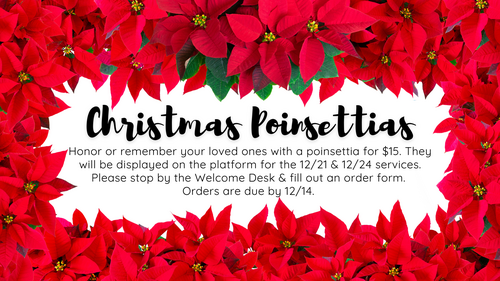 As a church family, we would like to express our love and appreciation to Pastor Steve, Pastor Doug, Pastoral Intern Blake, and their families by collecting a love-offering for Christmas. If you would like to contribute, please use the envelopes designated “Christmas for Pastors” located at the Welcome Desk and in the pews. You may also give online, please select the fund "Christmas for Pastors". We will collect these love gifts through Sunday, December 21st.