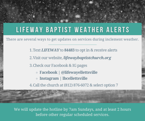 As we prepare for the possibility of severe weather this weekend, please remember that if roads are dangerous or conditions worsen, we may adjust or cancel services for everyone’s safety. All updates will be shared on our social media pages, website, text alerts, Lifeway app, and if possible, the church voicemail. Stay safe and take care!