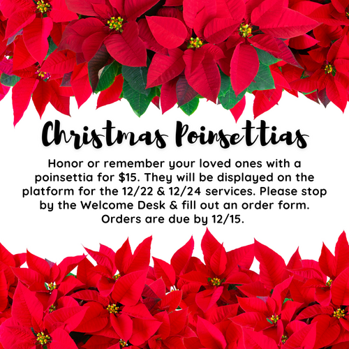 As a church family, we would like to express our love and appreciation to Pastor Steve, Pastor Doug, Pastoral Intern Blake, and their families by collecting a love-offering for Christmas. If you would like to contribute, please use the envelopes designated “Christmas for Pastors” located at the Welcome Desk and in the pews. You may also give online, please select the fund "Christmas for Pastors". We will collect these love gifts through Sunday, December 22nd.