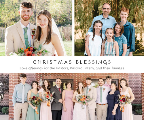 As a church family, we would like to express our love and appreciation to Pastor Steve, Pastor Doug, Pastoral Intern Blake, and their families by collecting a love-offering for Christmas. If you would like to contribute, please use the envelopes designated “Christmas for Pastors” located at the Welcome Desk and in the pews. You may also give online, please select the fund "Christmas for Pastors". We will collect these love gifts through Sunday, December 22nd.